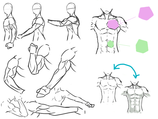 Podemos notar el ancho de los hombros. Además para adoptar el estilo manga, los músculos son levemente mas “cuadrados” que en una mujer, el ancho del cuerpo es mayor. Como en los pectorales, en los brazos notamos el bíceps, tríceps y demás músculos más pronunciados, al igual que las venas y los tendones.
