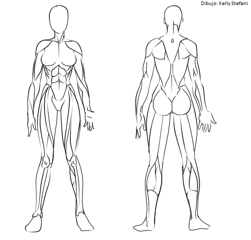 En la mujer, los músculos son exactamente los mismos, lo que es importante notar son las formas en las que se diferencian ambos cuerpos, Como la anchura de los hombros, brazos mas delgados en la mujer, cuerpo mas delgado y pequeño, etc.