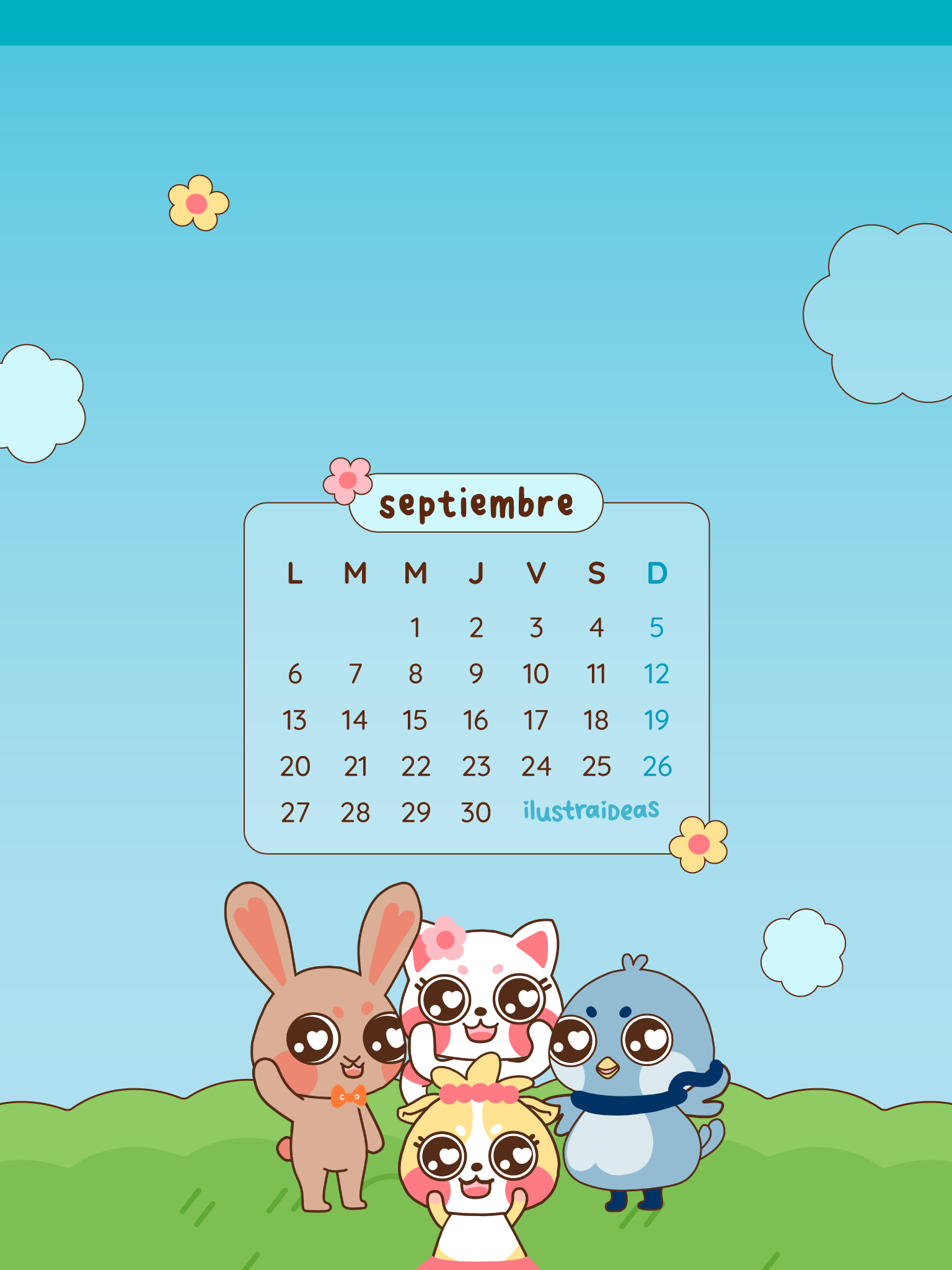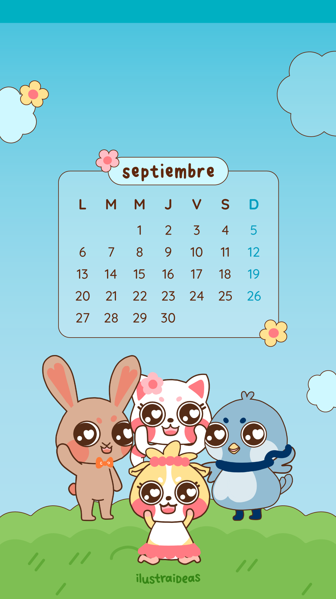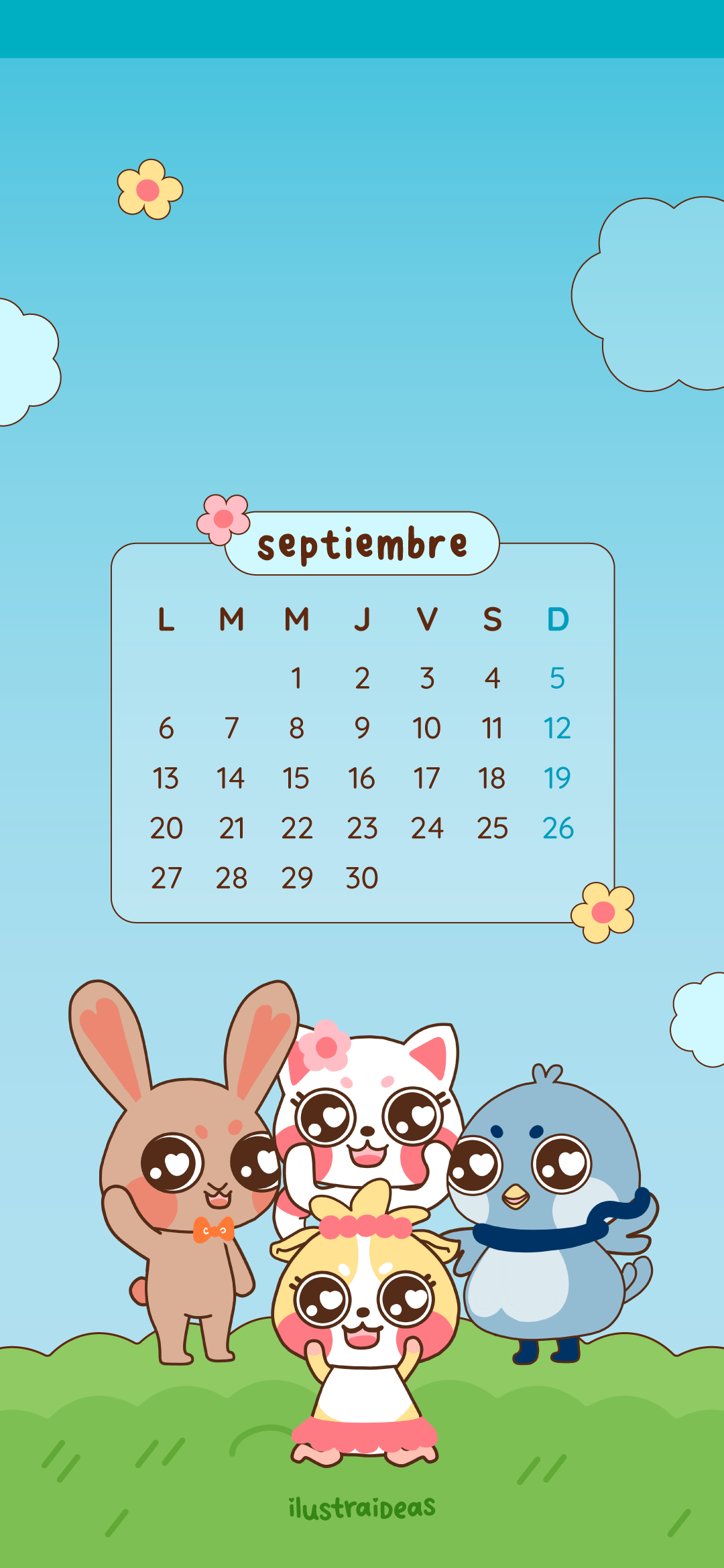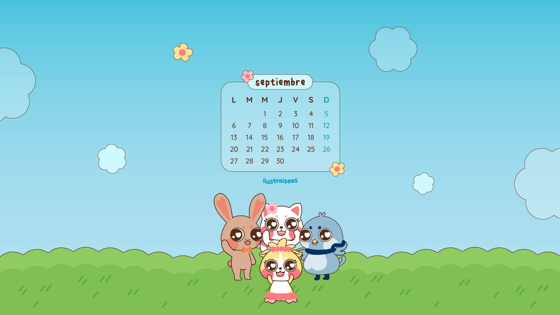 Descarga este práctico y kawaii calendario wallpaper de septiembre de las mascotas de Ilustraideas, para que uses en tu celular o tu computador.